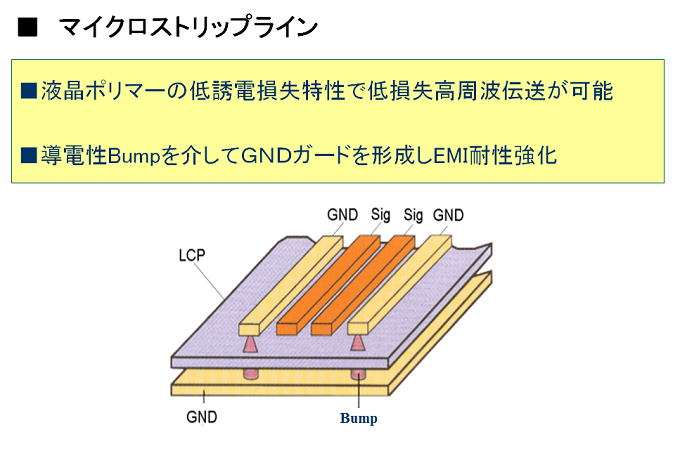 (LCP)を採用したFPCであり、低誘電率、低誘電正接のため低損失・高周波特性に優れています。また、低吸湿性で寸法安定性に優れており微細パターン加工が容易であり正確なインピーダンス整合が可能です。ガスバリア性も極めて高く、劣悪な使用環境でも使用可能です。製品用途として、ミリ波帯域の高周波基板、高温高湿環境、高ガスバリア性を求められる環境にて特性を満足致します。